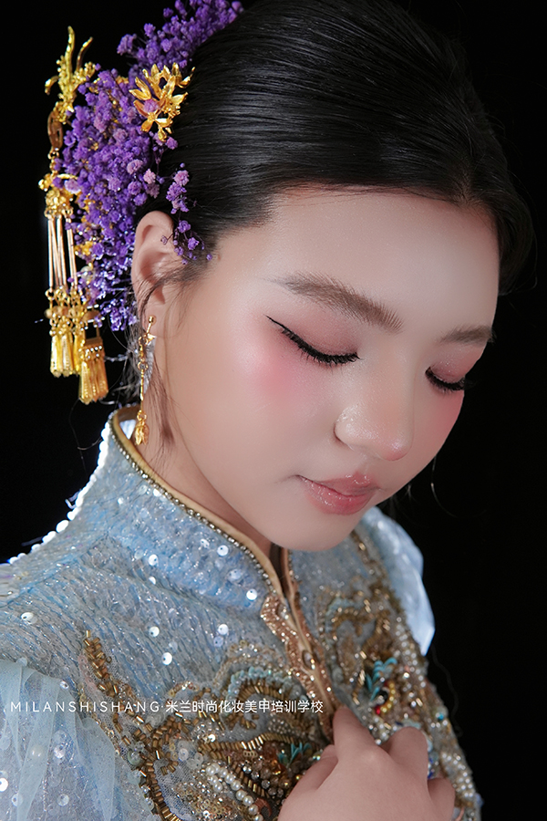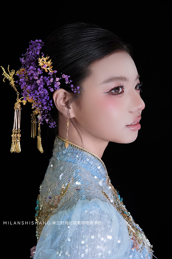 2026-03-18 一袭蓝秀禾,清雅又端庄。 一袭蓝秀禾,清雅又端庄。低饱和妆面干净通透,眉眼温婉柔和,不抢色、不浮夸,衬得肤色白皙透亮,把中式温婉与高级清冷感完美融合。#安阳米兰时尚化妆美甲培训学校